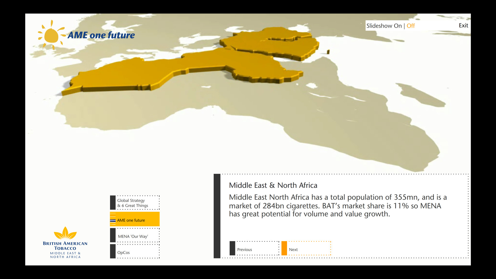 Screen design in line with brand guidelines, animated graphics, 3D modeling & 3D animation, scripting, content database. Motion effects were layered to keep 3D animations to minimum resolution while adapting with adaptive vector graphics to adapt to varying screen displays.